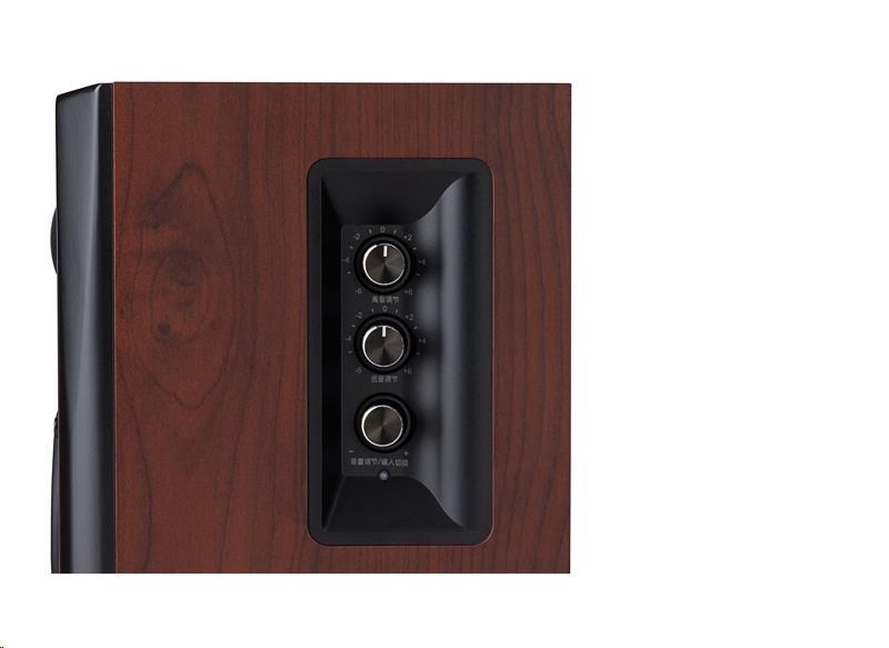 Ovládací knoby na boční straně monitoru umožňují snadné ovládání hlasitosti, basů a výšek. Funkce se navíc dají ovládat prostřednictvím dálkového ovládání, které přináší i možnost přepínání mezi jednotlivými vstupy. Monitory disponují DSP (Digital Signal Processing) a DRC (Dynamic Range Control) funkcemi, kompaktními rozměry a zároveň vysokým výkonem. Černá barva v kombinaci s tmavě hnědým dřevem dotváří celkový elegantní design.