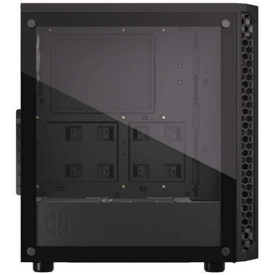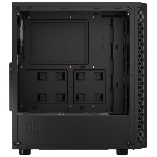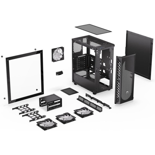 Skříň formátu Middle Tower s průhlednou bočnicí z tvrzeného skla nabízí dvě 2,5" pozice pro SSD disky a dvě 3,5" pozice pro pevné disky. Na horní části se nachází dva USB 3.0 porty, sluchátkový výstup a audio vstup pro mikrofon. Vybavena je čtyřmi 120 mm ventilátory s ARGB podsvícením, které spolu s perforovaným čelním panelem zajišťují dostatečné proudění vzduchu. Důmyslné řešení umožňuje pohodlné umístění až 360 mm dlouhého výměníku vodního chlazení na přední straně. Ve skříni je dostatek prostoru pro chladič CPU do výšky až 161 mm a grafickou kartu o délce až 350 mm. Dodávána je bez zdroje. Součástí je také sada prachových filtrů.