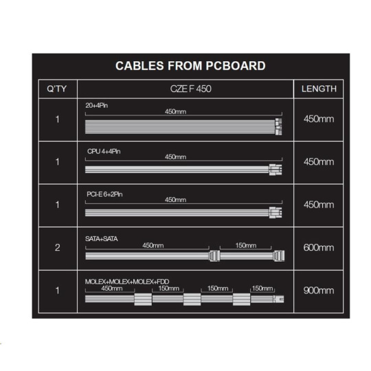 • 1x MOLEX, 450mm + MOLEX 150mm + MOLEX 150 mm + FDD 150 mm