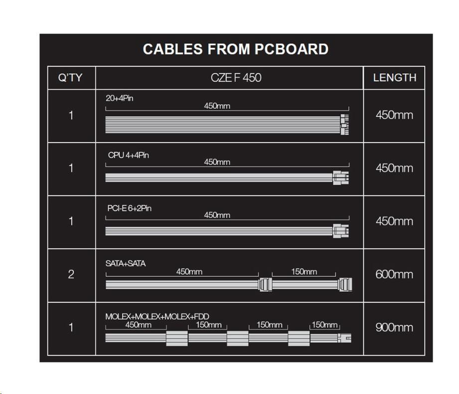 - 1x MOLEX, 450mm + MOLEX 150mm + MOLEX 150 mm + FDD 150 mm