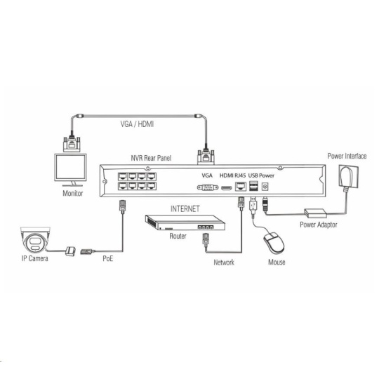 | Obsah balení | NVR jednotka s 8x LAN/POE vstupem, SATA připojením pro až 8TB disk 4x POE Bullet IP66 kamera s nočním přísvitem 1x napájecí adaptér DC 48V 2A 4x sada pro upevnění kamery 4x bajonetová těsnící krytka pro RJ45 konektor 1xUSB myš 1xSATA kabel pro připojení HDD 1x Uživatelský manuál |