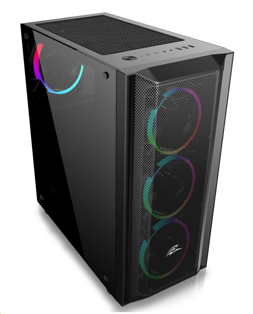 Herní ATX midi tower s instalovanými 4x RGB rainbow 120 mm ventilátory, které se ovládájí pomocí LED tlačítka na horní straně ovládacího panelu. Čelní mřížka přes celý přední kryt zajišťuje efektivní proudění vzduch. Levá strana skříně obsahuje bočnici z tvrzeného skla. Skříň je určená pro základní desky podporující platformu Intel i AMD. Mimo formátu ATX je kompatibilní i s formátem Micro ATXa Mini ITX. Napájecí zdroj se umísťuje do dolní části skříně. Spodní mřížka je osazena vysouvacím prachovým filtrem, horní prachový filter je uchycený magnety a je odnímatelný.