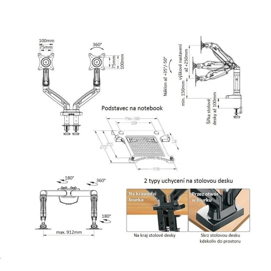 Fiber Mounts H3F160 držák notebooku a monitoru Sestava držáku na monitory NB F160 + držáku na notebook Ergosolid NBH3 za zvýhodněnou cenu, umožňuje dát na držák monitor 17" - 27" a notebook 10,1" - 17", otáčení do stran, naklápění, délkové a výškové polohování, nosnost 2x 9 kg Špičkový stolní držák do kanceláře, firmy nebo domácnosti pro zavěšení monitoru a notebooku. Držák umožňuje kompletní polohovatelnost jak monitoru tak i notebooku - otáčení do stran, náklon, délkové a výškové nastavení, korekci roviny. Ramena mají systém pro vedení kabeláže. Uchycení je možné na všechny typy stolů nebo desek o síle 10mm až 100mm, jsou možné 2 způsoby uchycení - na kraj stolové desky nebo kamkoliv do prostoru (ukotvení skrz stolovou desku - nutný otvor). Stolní držák pro uchycení notebooku (laptopu) a monitoru Fiber Mounts H3F160 je vynikající kvality, velmi pěkného designu a poskytujeme na něj záruku 5 let. Stolní držák na monitor a notebook do kanceláře, pracovny, firmy nebo domácnosti Fiber Mounts H3F160 Technické údaje: možné zatížení každého ramene 2kg až 9kg celková nosnost držáku 18kg podporuje VESA standardy 75x75 a 100x100 doporučená úhlopříčka monitoru 17" až 27" na notebooky a laptopy 10,1" až 17" výškové polohování 250mm otočný +180° / -180° náklon +35° / -50° funkce pivot - otočení monitoru do horizontální nebo vertikální polohy korekce roviny monitoru i notebooku vhodný pro uchycení všech notebooků a laptopů, které mají šířku 255-380 mm systém pro vedení kabeláže výborná kvalita krásný design záruka 5 let.