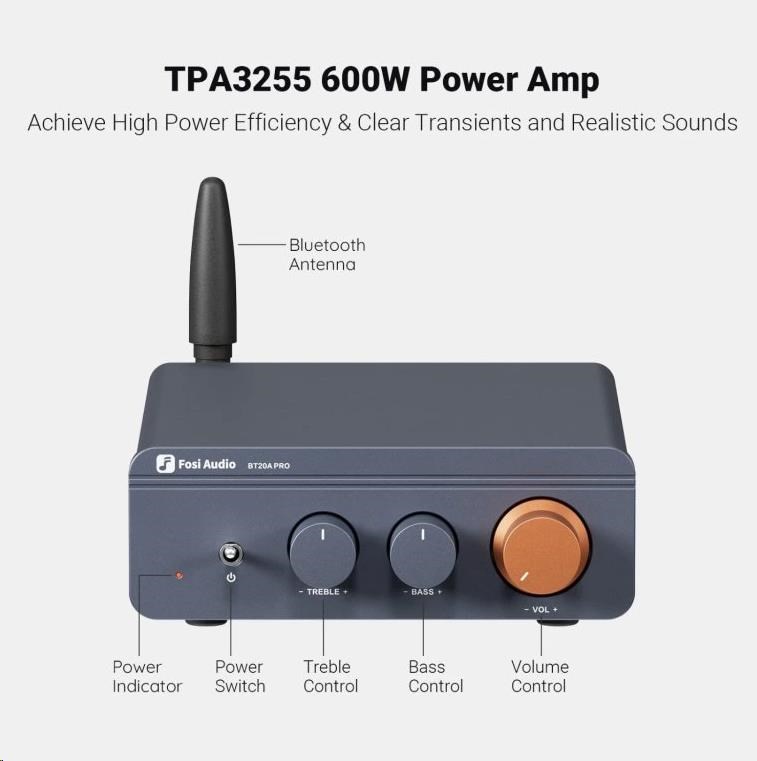 Základem BT20A Pro je účinný výkonový stupeň, který poskytuje dostatek energie pro většinu pasivních reproduktorů. Zvuk je čistý, dynamický a dobře kontrolovaný, s pevnými basy a detailními středy. Díky moderní technologii třídy D zůstává zesilovač energeticky efektivní a produkuje minimum tepla.