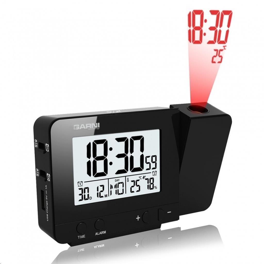 Digitální budík s projekcí času a vnitřní teploty s LCD displejem, časem řízeným rádiovým signálem DCF-77 a měřením vnitřní teploty a relativní vlhkosti LCD displej o rozměrech 63 x 42 mm s možností stálého osvětlení při napájení síťovým adaptérem, nebo krátkodobým osvětlením na 8 s při napájení bateriemi 3 stupně jasu osvětlení displeje, možnost vypnutí osvětlení displeje (při napájení síťovým adaptérem) velikost číslic na displeji – čas 25 mm, datum, zkratka názvu dne, vnitřní teplota a rel. vlhkost 8,5 mm čas a datum řízené signálem DCF-77 s možností manuálního nastavení ikona příjmu signálu DCF-77 zkratka názvu dne 12ti, nebo 24 hodinový formát zobrazení času možnost nastavení časového pásma od -12 do +12 hodin budík s 2 budícími časy s funkcí opakovaného buzení (Snooze) po 5 minutách budící signál - 10 sekund 1 pípnutí za sekundu, 10 sekund 2 pípnutí za sekundu, 10 sekund 4 pípnutí za sekundu a poté stálé pípání projekce času a vnitřní teploty s možností otočení obrazu o 180°, možnost sklopení tubusu projektoru o 90° dopředu a dozadu barva projekce červená stálá projekce při napájení síťovým adaptérem s možností vypnutí zobrazení hodnot vnitřní teploty a relativní vlhkosti zobrazení teploty ve °C, nebo °F USB port pro nabíjení mobilních zařízení (pouze při napájení hlavní jednotky síťovým adaptérem), maximální nabíjecí proud 1 000 mA napájení síťovým adaptérem, nebo bateriemi možnost postavení barva černá Obsah balení: 1 x digitální budík GARNI 140 1 x síťový adaptér český, slovenský, německý, anglický, italský, polský a maďarský návod.