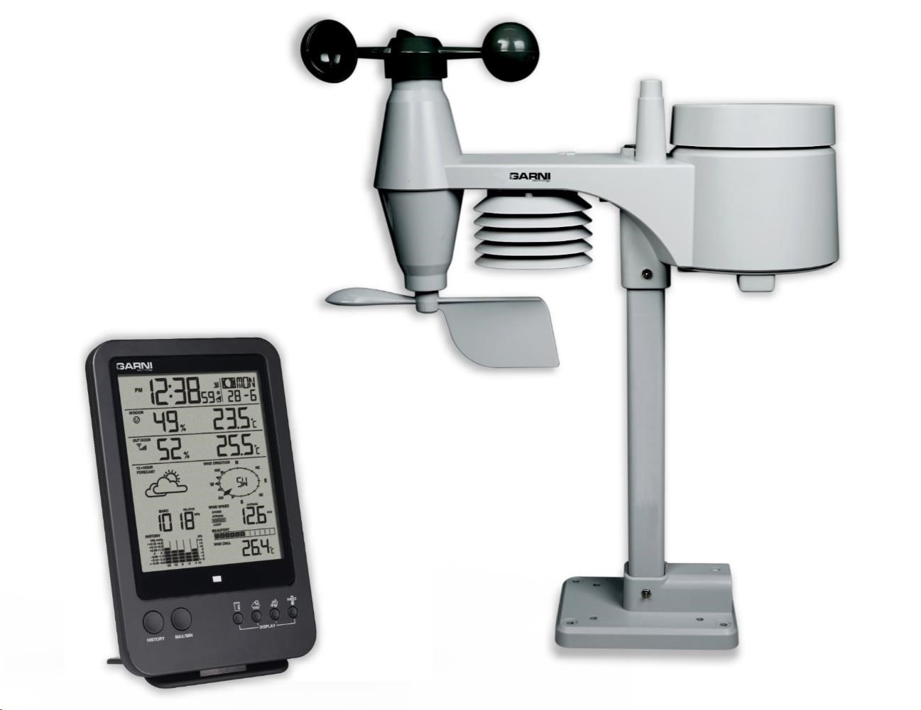 - voděodolné integrované bezdrátové čidlo 5 v 1 (teplota, relativní vlhkost, rychlost větru, směr větru, dešťové srážky)