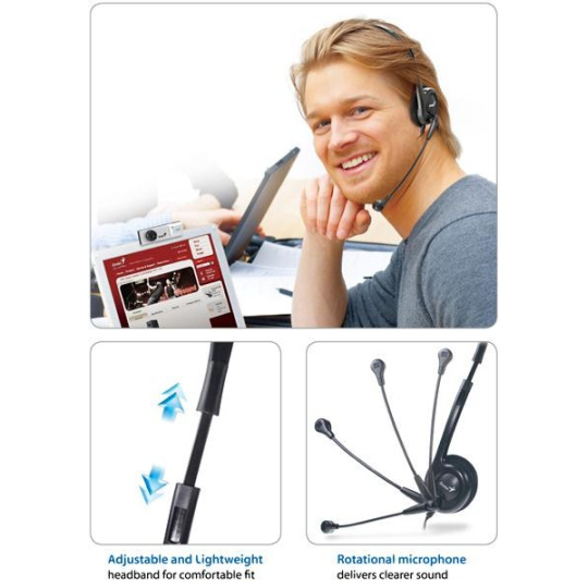 |   Popis produktu: • Nastavitelná velikost • Měkké sluchátka • Otočný mikrofon • Vhodné pro MSN, SKYPE a chatování po internetu Frekvenční rozsah: 20Hz~20KHz Citlivvost sluchátek: 105dB Impedance (@1KHz): 32ohm Délka kabelu: 1.8m Citlivost mikrofonu: -38dB Rozhraní: 3.5mm jack Ovládání hlasitosti: Ne Hmotnost: 57g