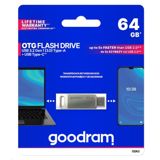 Type-C™ is becoming the most popular USB type used to transfer data between all electronic devices. The growing popularity of this solution is supported by the fact that manufacturers of next gen laptops, smartphones, PCs and other devices are increasingly equipping their products with an additional “C” next to the standard type A connector or choose only Type-C™. GOODRAM OTG ODA is an excellent solution that will work both with an old and new electronic devices generation laptops, smartphones and PCs. The ODA Flash drive is equipped with two fast USB 3.2 connectors: one standard type A and the Type-C™, which means that data transfer between devices of different generations has never been so easy and fast.