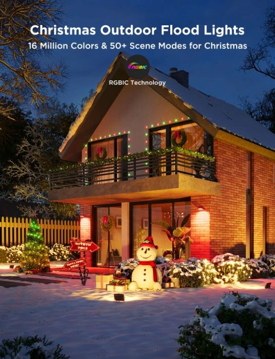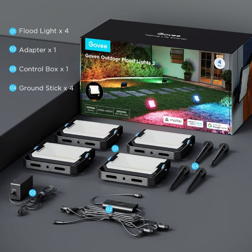 Venkovní úsporná LED reflektory Smart Flood Lights 2 udělají z vaší zahrady designový skvost. Díky technologii RGBICWW umí svítit až 1000 lm, zobrazit až 16 milionů barev. Určitě si vyberete z více než 50 režimů osvětlení a při poslouchaní oblíbené hudby si můžete zvolit také ze 6 rytmických režimů. Nebo si prostě nastavte svoje vlastní barevné kombinace podle libosti na každém ze 4 LED světel. Příkazy můžete zadat také hlasem přes Siri, Amazon Alexa nebo Google Assistant nebo přes aplikaci Govee Home na chytrém telefonu nebo tabletu. Nově světla podporují Matter, takže nativně podporují i Apple Homekit. Světlo má celkovou délku skoro 16 metrů a jeho instalace je velice jednouchá. Pomocí časovače můžete světla zapínat a vypínat automaticky podle západu a východu slunce. Světla mají index ochrany proti vodě IP66 (kromě zdrojového adaptéru) s provozní teplotou od -20°C do 40°C.