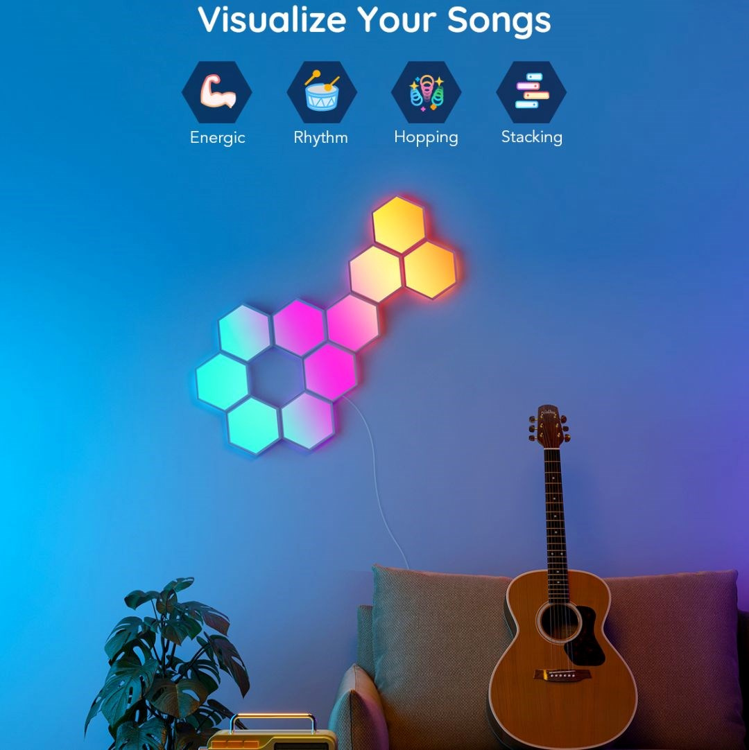 Vylepšete interiér a herní, filmové a hudební zážitky s designovým světlem Hexa Smart LED. Díky technologii RGBIC zobrazuje až 57 barev najednou. Barevnost si můžete nastavit po jednotlivých sekcích a kreativně si pohrát. Celkově umí zobrazit až 16 milionů barev s intenzitou 1-100%. Určitě si vyberete z mnoha režimů osvětlení a při poslouchaní oblíbené hudby si můžete zvolit také ze 6 rytmických režimů. Světla se ovládají hlasem přes Siri, Amazon Alexa nebo Google Assistant nebo přes aplikaci Govee Home na chytrém telefonu nebo tabletu. Světlo je určeno na instalaci na zeď a jeho tvar si můžete přizpůsobit podle vlastní fantazie. Jednoduchá instalace bez vrtání s životností až 50.000 hodin.