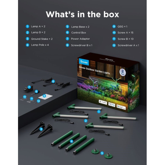 Venkovní světla Govee podporují nejmodernější standard Matter, který umožňuje jednoduchou a bezproblémovou integraci do chytré domácnosti. Díky této technologii můžete světla ovládat hlasovými příkazy přes oblíbené asistenty, jako jsou Amazon Alexa či Google Home. Stačí jedno slovo a světla se rozsvítí, změní barvu nebo zapnou oblíbenou scénu. Pohodlné a intuitivní ovládání tak přináší maximální komfort a svobodu ve vašem venkovním osvětlení.
