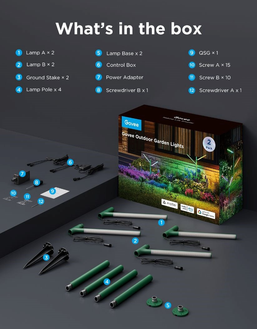 Venkovní světla Govee podporují nejmodernější standard Matter, který umožňuje jednoduchou a bezproblémovou integraci do chytré domácnosti. Díky této technologii můžete světla ovládat hlasovými příkazy přes oblíbené asistenty, jako jsou Amazon Alexa či Google Home. Stačí jedno slovo a světla se rozsvítí, změní barvu nebo zapnou oblíbenou scénu. Pohodlné a intuitivní ovládání tak přináší maximální komfort a svobodu ve vašem venkovním osvětlení.
