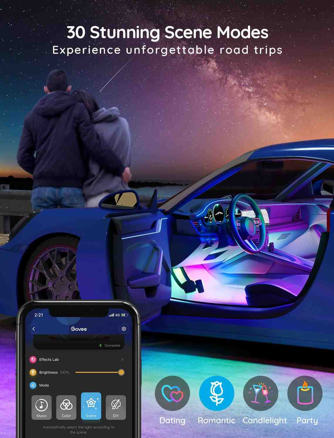 Úsporné interiérové chytré LED pásky Govee Smart RGBIC do auta s životností až 50.000 hodin vylepší interiér vašeho automobilu a poskytnou zážitek, který se naskytuje u luxusních vozů. Můžete je použít prakticky všude, kde je zapalovaní. Zobrazuje až 16 milionů barev, jejichž intenzitu lze nastavit od 1-100%. Díky technologii RGBIC si můžete rozdělit pásek na samostatné segmenty, pro které si můžete pak volit rozdílné barvy. Vyberte si ze 30 režimů osvětlení a při poslouchaní oblíbené hudby se budou světla synchronizovat. Nebo si prostě nastavte svoje vlastní barevné kombinace v režimu DIY. Příkazy můžete zadat přes aplikaci Govee Home na chytrém telefonu nebo tabletu nebo přímo na Control boxu. Instalace je jednoduchá a je rozdělená na přední a zadní část automobilu.