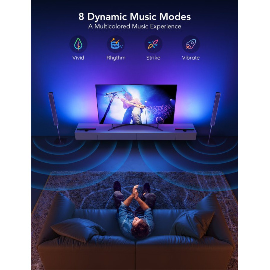 Vyberte si z 8 hudebních režimů. Díky vestavěnému mikrofonu se světelné panely hladce synchronizují s vaší hudbou nebo atmosférickými zvuky vydávanými z vaší televize nebo počítače při sledování filmů nebo hraní her.