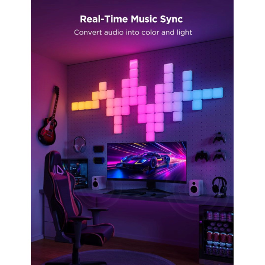 Světla lze snadno připevnit pomocí předinstalované 3M pásky, což znamená, že žádné vrtání ani komplikace nejsou potřeba. Balení obsahuje 10 panelů, které můžete libovolně kombinovat do různých tvarů a sestav – dokonce je možné propojit až 70 panelů najednou! Ovládání světel je snadné díky chytré aplikaci, která umožňuje výběr z přednastavených scén, hudební vizualizace i vlastní nastavení barev.