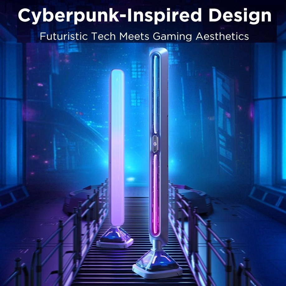 Světelné panely Govee Gaming Light Bars Pro, které jsou určeny k umístění vedle vaší televize nebo monitoru. Tyto elegantní světelné lišty s cyberpunkovým designem vytvářejí úchvatnou vizuální atmosféru. Ať už jste ponořeni do hry nebo sledujete oblíbený film, tyto lišty přinášejí dynamické a živé barvy, které každý moment dělají intenzivnějším.