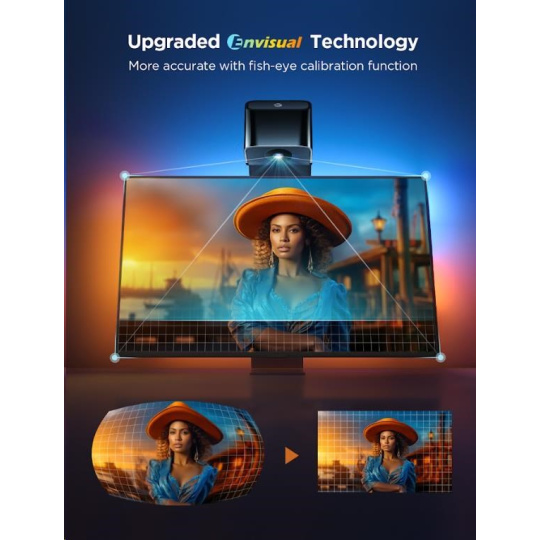 Govee Backlight 3 Lite spoléhá na přesnou reprodukci barev na obrazovce pomocí kamery. Ta je nově vylepšena o korekci zkreslení, takže podsvícení přesně navazuje na barvy na obrazovce a tím vytváří imerzivní vizuální zážitek. Kamera se pro kompatibilitu se soundbary umisťuje nad televizi a počítá i s ultra tenkými modely obrazovek.