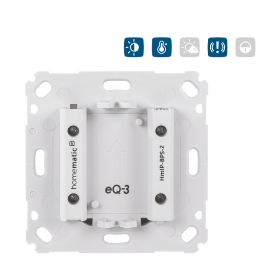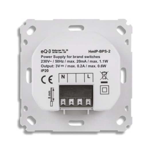 Napájecí zdroj bateriových komponent 55 mm (HmIP-BPS-2) je součástí systému chytré domácnosti Homematic IP a slouží jako praktická dokovací stanice pro napájení bateriových komponent o velikosti 55 mm s připojením do stávající elektrické sítě 230 V a umístěním do standardní zápustné krabice pod omítku.