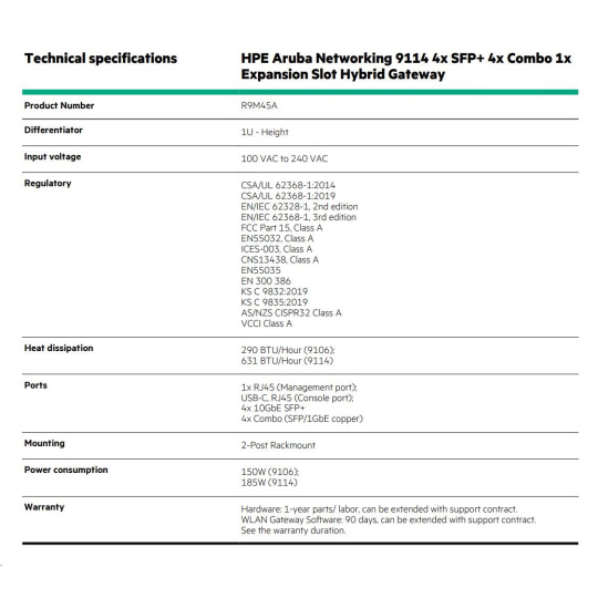HPE Aruba Networking 9114 4x SFP+ 4x Combo 1x Expansion Slot Hybrid Gateway R9M45AR RENEW