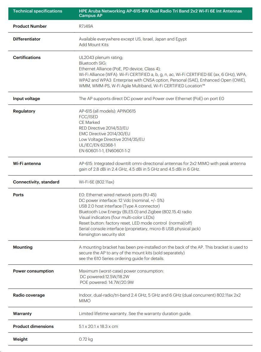 HPE Aruba Networking AP-615 (RW) 2-Radio 3-Band 2x2 Wi-Fi 6E Internal Antennas 10-pack Campus AP