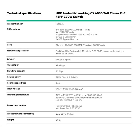 HPE Aruba Networking CX 6000 24G Class4 PoE 4SFP 370W Switch.