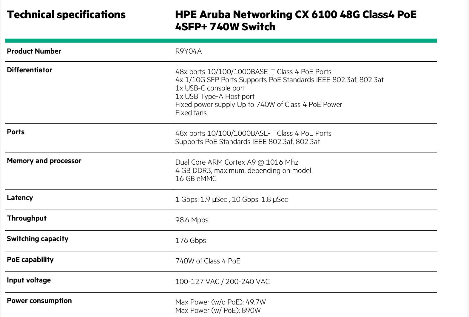 HPE Aruba Networking CX 6100 48G Class4 PoE 4SFP+ 740W Switch