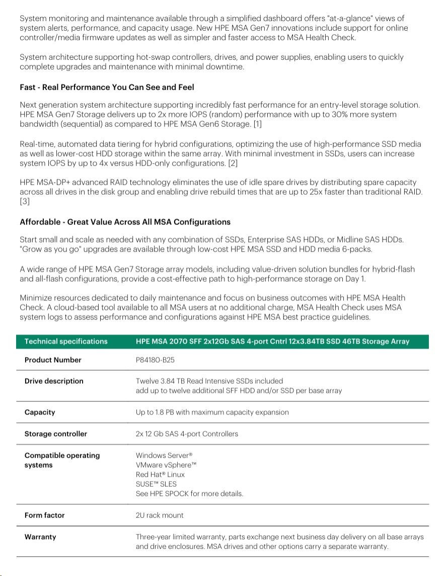 HPE MSA 2070 SFF 2x10/25GbE iSCSI 4-port Controller 12x3.84TB SSD 4x25Gb iSCSI XCVR 46TB Storage Array Smart Choice.