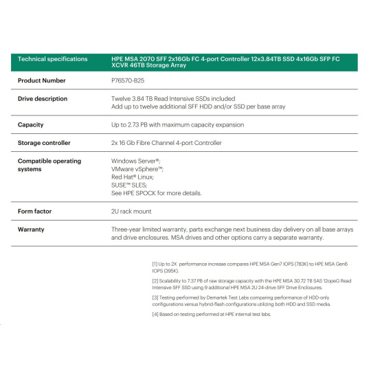 HPE MSA 2070 SFF 2x16Gb FC 4-port Controller 12x3.84TB SSD 4x16Gb SFP FC XCVR 46TB Storage Array