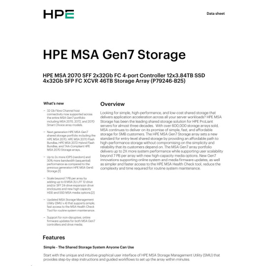 HPE MSA 2070 SFF 2x32Gb FC 4-port Controller 12x3.84TB SSD 4x32Gb SFP FC XCVR 46TB Storage Array Smart Choice