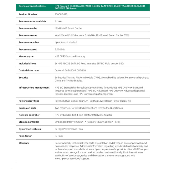 HPE PL DL20g11 E-2434 (3.4G/4C) 1x32G (P64339) 2x480G VROC 4SFF 1x800W 4x1G NBD333 Smart Choice