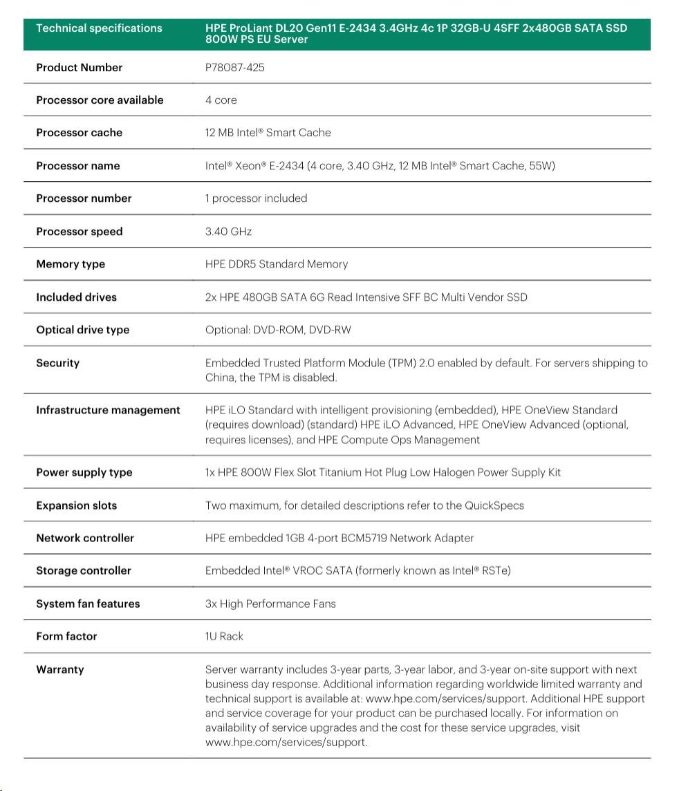 HPE PL DL20g11 E-2434 (3.4G/4C) 1x32G (P64339) 2x480G VROC 4SFF 1x800W 4x1G NBD333 Smart Choice