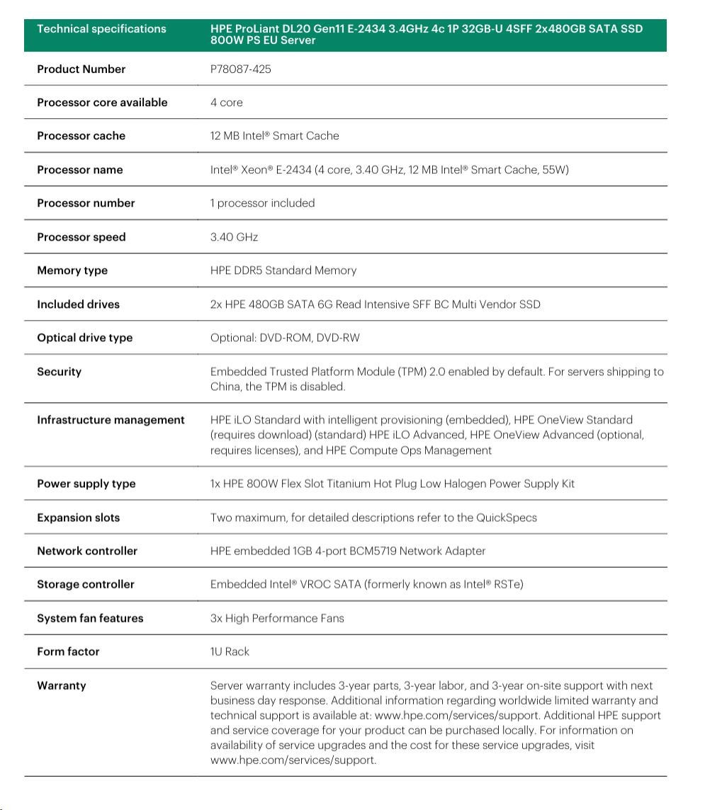 HPE PL DL20g11 E-2434 (3.4G/4C) 1x32G (P64339) 2x480G VROC 4SFF 1x800W 4x1G NBD333 Smart Choice.