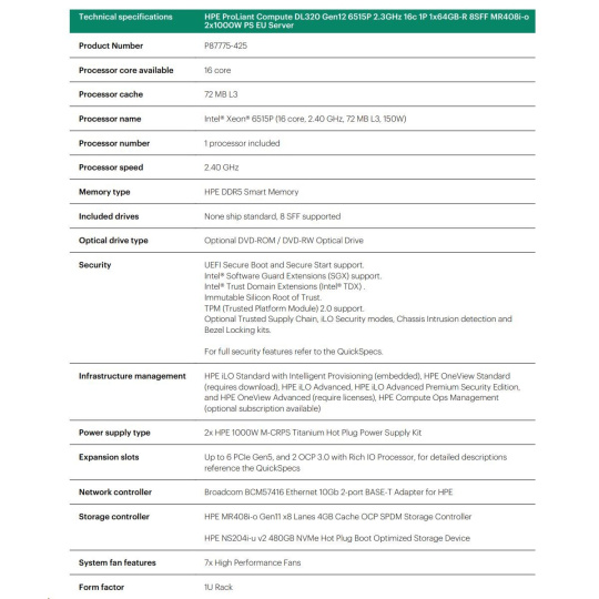 HPE PL DL320 Gen12 6505P (2.2/12C) 1x64G (P69728) 2x480G MR408i-o 8SFF 2x1000W 1GbE NBD333 Smart Choice.