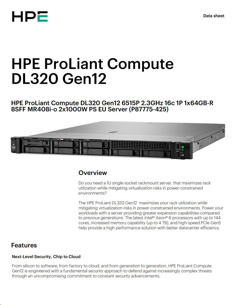 HPE PL DL320 Gen12 6505P (2.2/12C) 1x64G (P69728) 2x480G MR408i-o 8SFF 2x1000W 1GbE NBD333 Smart Choice.