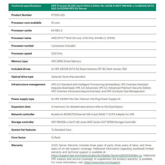 | Model Name | HPE ProLiant DL325 Gen11 9124 3.0GHz 16c 64GB-R 8SFF MR408i-o 2x480GB SATA SSD 2x1000W RPS EU Server |