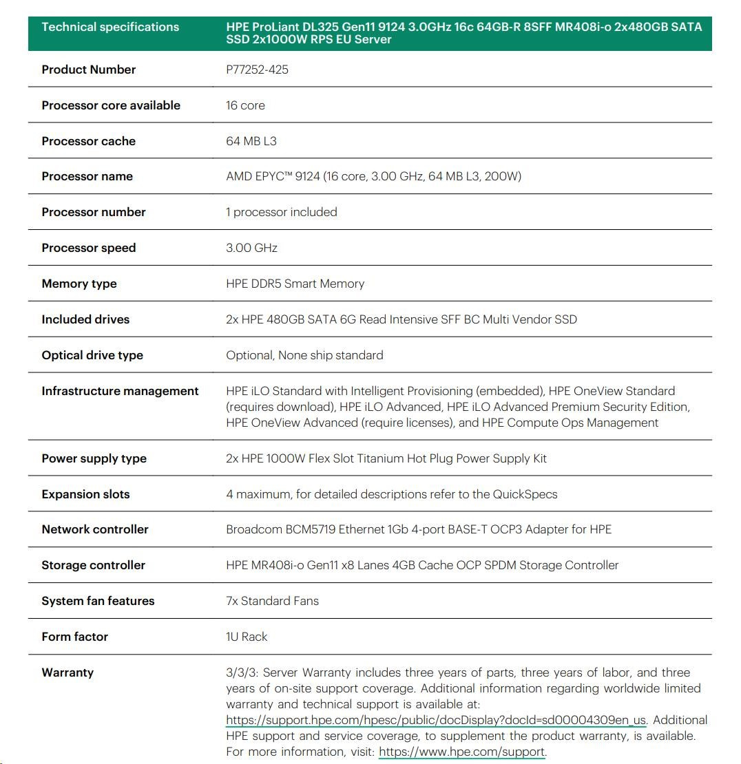 | Model Name | HPE ProLiant DL325 Gen11 9124 3.0GHz 16c 64GB-R 8SFF MR408i-o 2x480GB SATA SSD 2x1000W RPS EU Server |