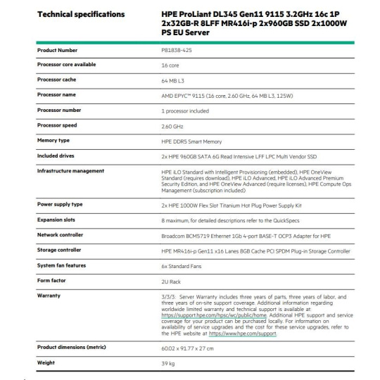 Warranty 3/3/3: Server Warranty includes three years of parts, three years of labor, and three years of on-site support coverage. Additional information regarding worldwide limited warranty and technical support is available at: https://support.hpe.com/hpsc/wc/public/home. Additional HPE support and service coverage for your product can be purchased locally. For information on availability of service upgrades and the cost for these service upgrades, refer to the HPE website at https://www.hpe.com/support.