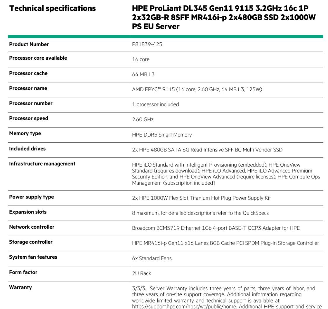 HPE PL DL345g11 AMD Epyc 9115 (2.6G/16C) 2x32G 2x480G (P40497) 2x1000W MR416i-p 8SFF 4p1G Smart Choice