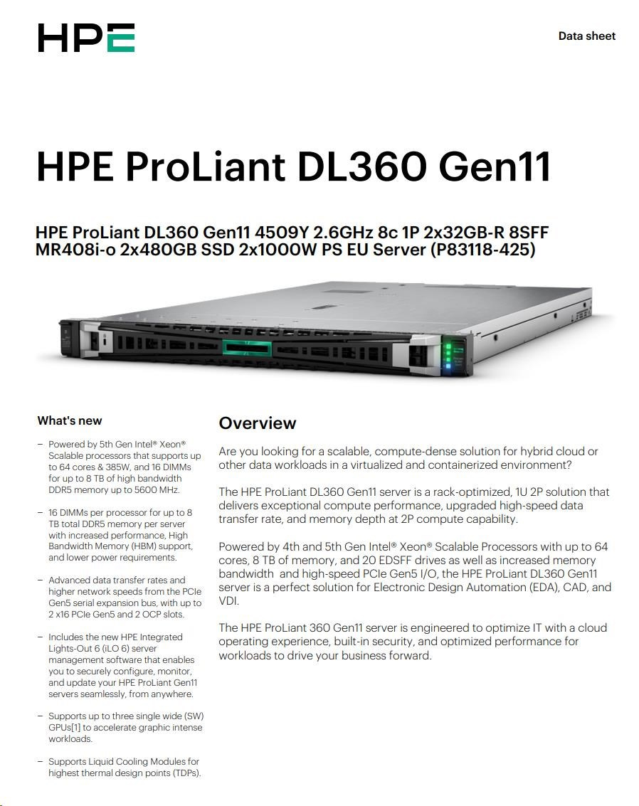 HPE PL DL360g11 4509Y (2.6G/8C) 2x32G (p64706) 2x480G 2x1000W MR408i-o 8SFF 4p1G ocp Smart Choice