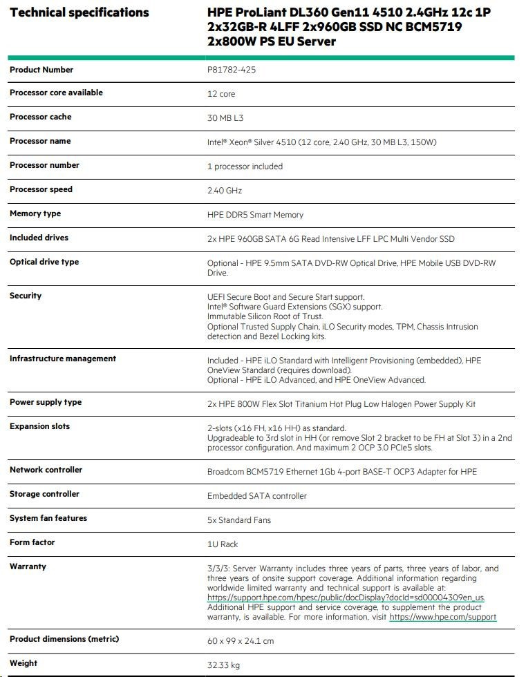 Provedení serveru:Rack, 1U Rack; Výrobce CPU:Intel; Maximální počet procesorů:2; Řada procesorů:Intel 12 Core Xeon; SSD Kapacita (GB):960; Model procesoru:Intel Xeon 4510; Velikost paměti RAM (GB):64; Maximální paměťová kapacita serveru (GB):3072; Maximální počet slotů PCIe:2; Maximální počet HDD v serveru:4; Hot-plug cage pro HDD:3.5" LFF; RAID:1, 10.... více