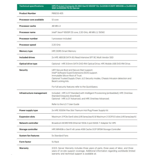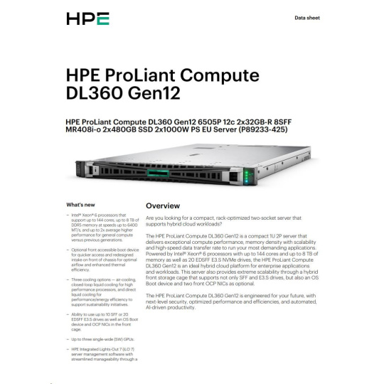 HPE PL DL360g12 6507P (3.5G/8C) 2x32G (P69727) 2x480G MR408i-o 8SFF 2x1000W 10GbE NBD333 Smart Choice.