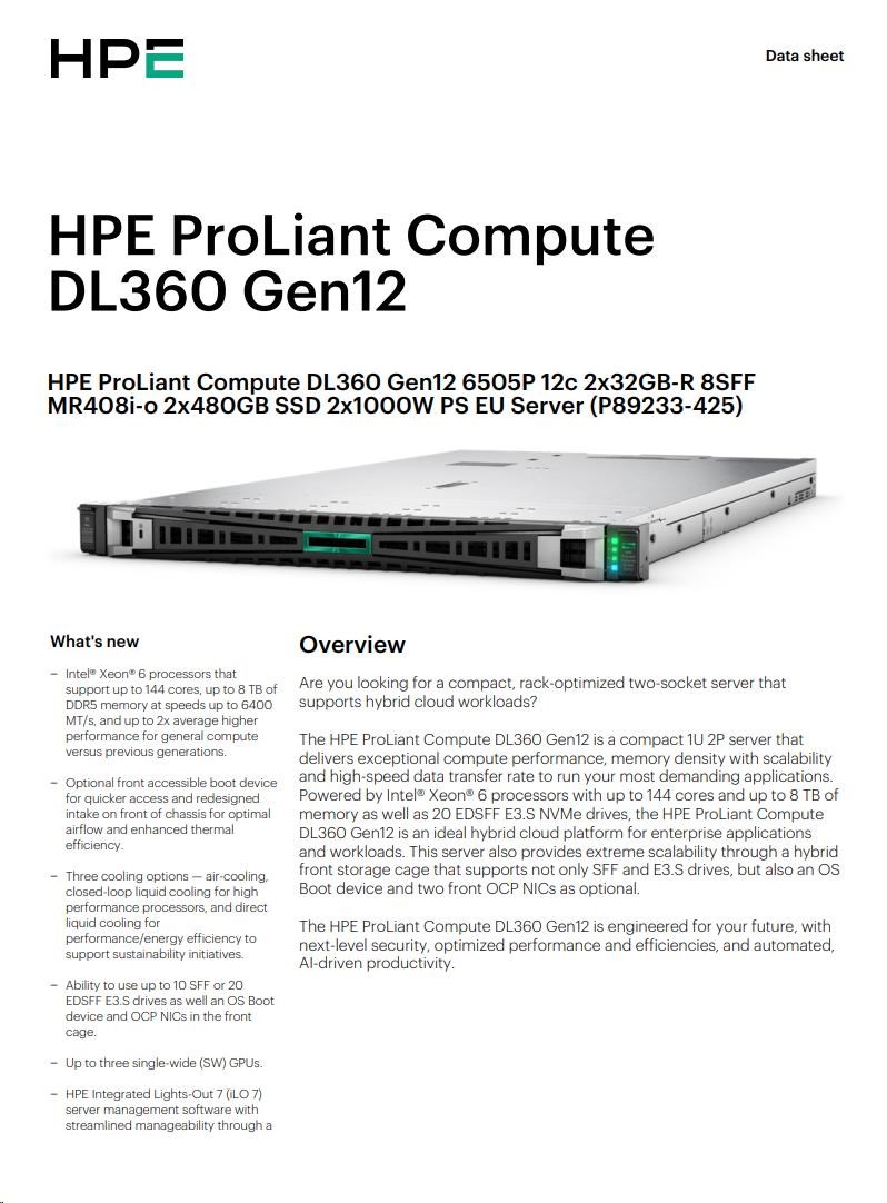 HPE PL DL360g12 6507P (3.5G/8C) 2x32G (P69727) 2x480G MR408i-o 8SFF 2x1000W 10GbE NBD333 Smart Choice.