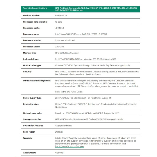 HPE PL DL380g12 6515P (2.4/16C) 2x32G (P69727) 2x480G MR408i-o 8SFF 2x1000W 2p10G-T NBD333 Smart Choice.