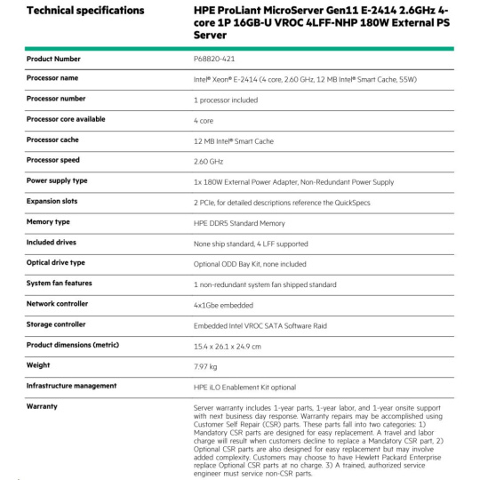 Technical specifications HPE ProLiant MicroServer Gen11 E-2414 2.6GHz 4core 1P 16GB-U VROC 4LFF-NHP 180W External PS Server P68820-421
