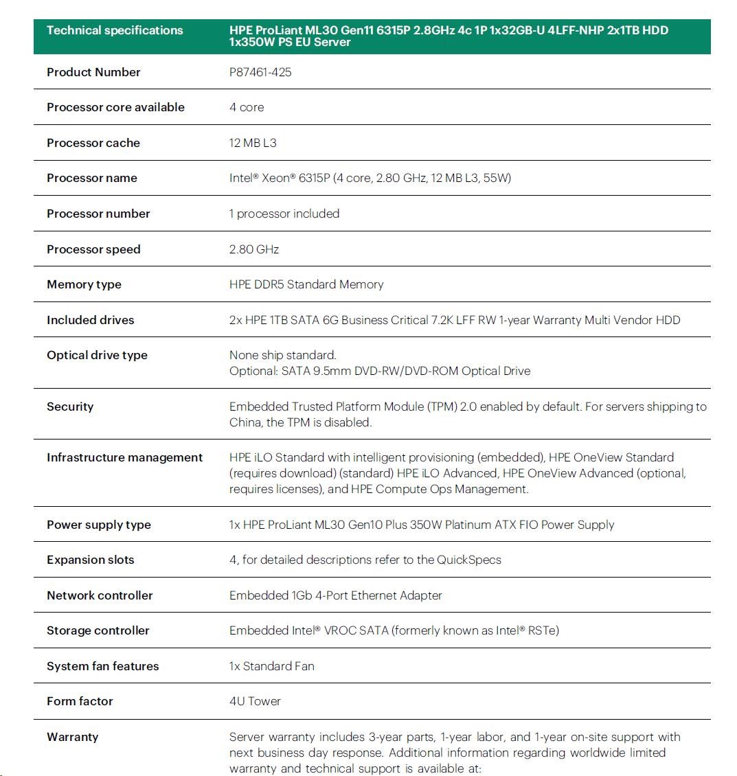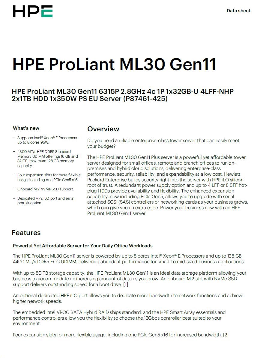HPE PL ML30g11 6315P (2.8G/4C4T) 1x32G 2x1TB SATA 4LFF-NHP 1x350 VROC 4p1G NBD311 Smart Choice.