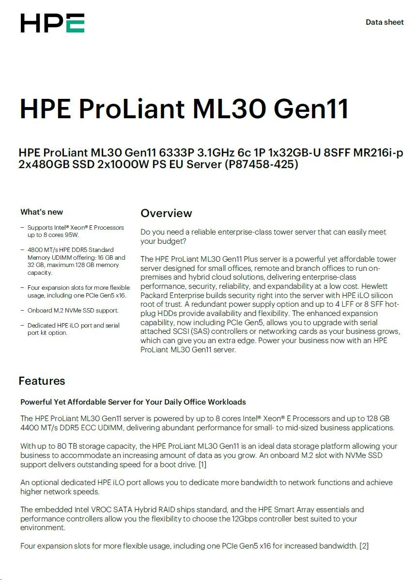 HPE PL ML30g11 6333P (3.1-5.1G/6C12T/65W) 1x32G 2x480G 2x1000W MR216i-p 8SFF 4p1G NBD311 Smart Choice