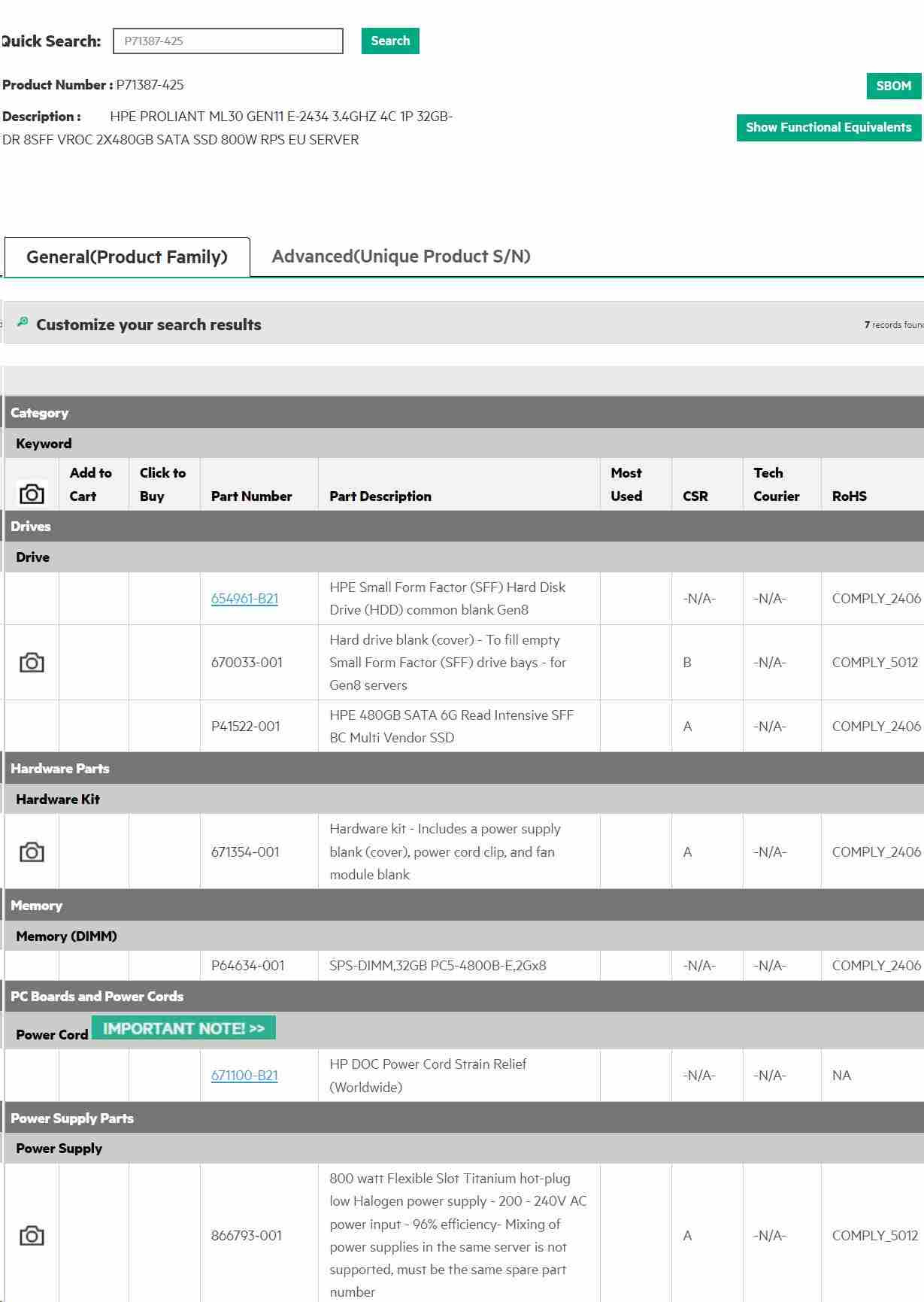 A camera icon in this column next to a part number indicates that a diagram or photograph is available showing that part. Click on the icon to retrieve the diagram or photo. Add to Cart Click to Buy Part Number Part Description Most Used CSR Tech Courier RoHS