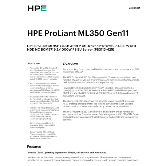HPE PL ML350g11 4510 (2.4G/12C) 1x32G (P64706) 2x4TB/7.2k SATA LFF VROC 2x1000W 4p1G Smart Choice.