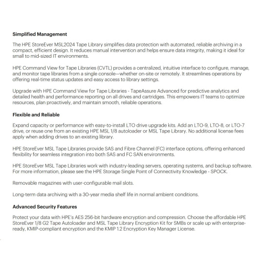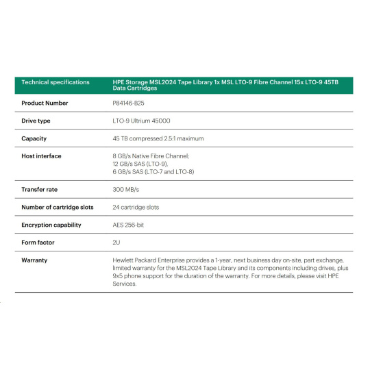 HPE Storage MSL2024 Tape Library 1x MSL LTO-9 Fibre Channel 15x LTO-9 45TB Data Cartridges