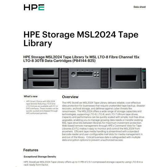 HPE Storage MSL3040 Tape Library 1x MSL LTO-9 Fibre Channel 20x LTO-9 45TB Data Cartridges